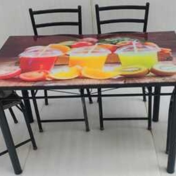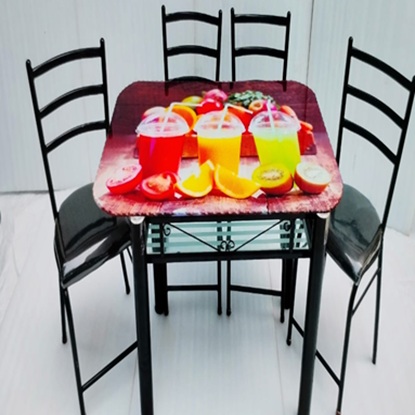 ఆధునిక 4 సీటర్ డైనింగ్ టేబుల్ సెట్ – బ్లాక్ మెటల్ ఫ్రేమ్, రంగుల ఫ్రూట్ జ్యూస్ డిజైన్ గ్లాస్ టాప్, కుషన్ సీటు కలిగిన కుర్చీలతో. ఈ సెట్ కుటుంబ భోజనాలకు, సమావేశాలకు అందంగా మరియు ఉపయోగకరంగా రూపొందించబడింది.
