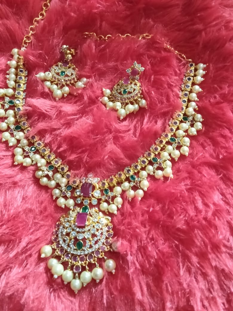 గులాబీ మరియు తెలుపు రాళ్లతో బంగారు పూత పూసిన చోకర్ నీలమణి, బహుశా చెవి రింగులతో సముద్రపు ఆకుపచ్చ పూసలు కూడా ఉండవచ్చు.