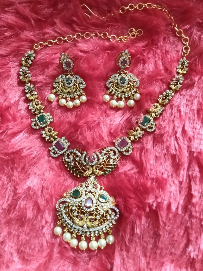 Pearls: The hanging pearls at the bottom of both the necklace pendant and earrings add an elegant touch.