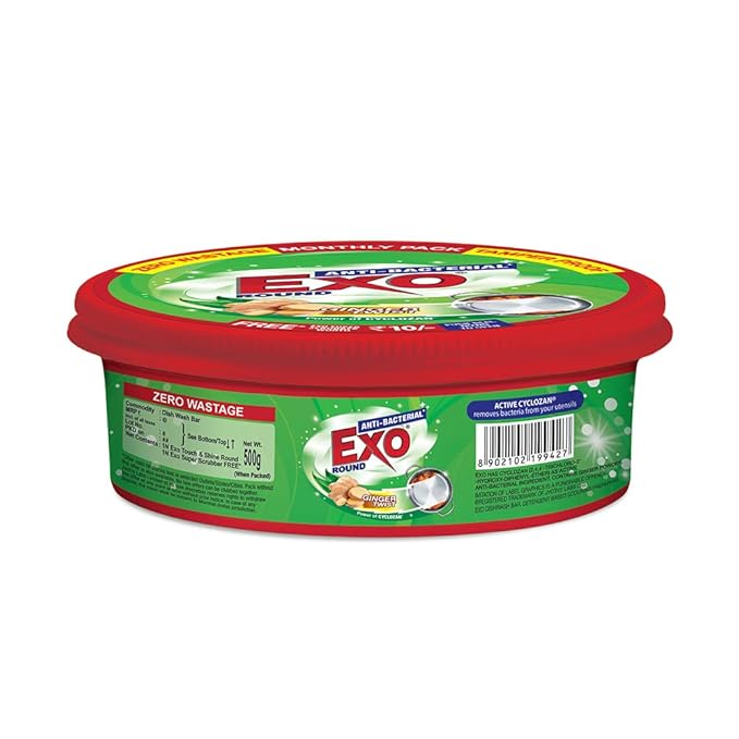 ఎక్స్వో రౌండ్ డిష్వాష్ బార్ 500 గ్రాముల ప్యాక్, అల్లం సువాసనతో, యాంటీబ్యాక్టీరియల్ గుణాలతో, సైక్లోజాన్ పదార్థం కలిగిన, ప్రత్యేక రౌండ్ ఆకారంతో, స్క్రబ్బర్తో కూడిన, సులభంగా వాడుకునే, శుభ్రత మరియు శుభ్రతను అందించే ఉత్పత్తి.