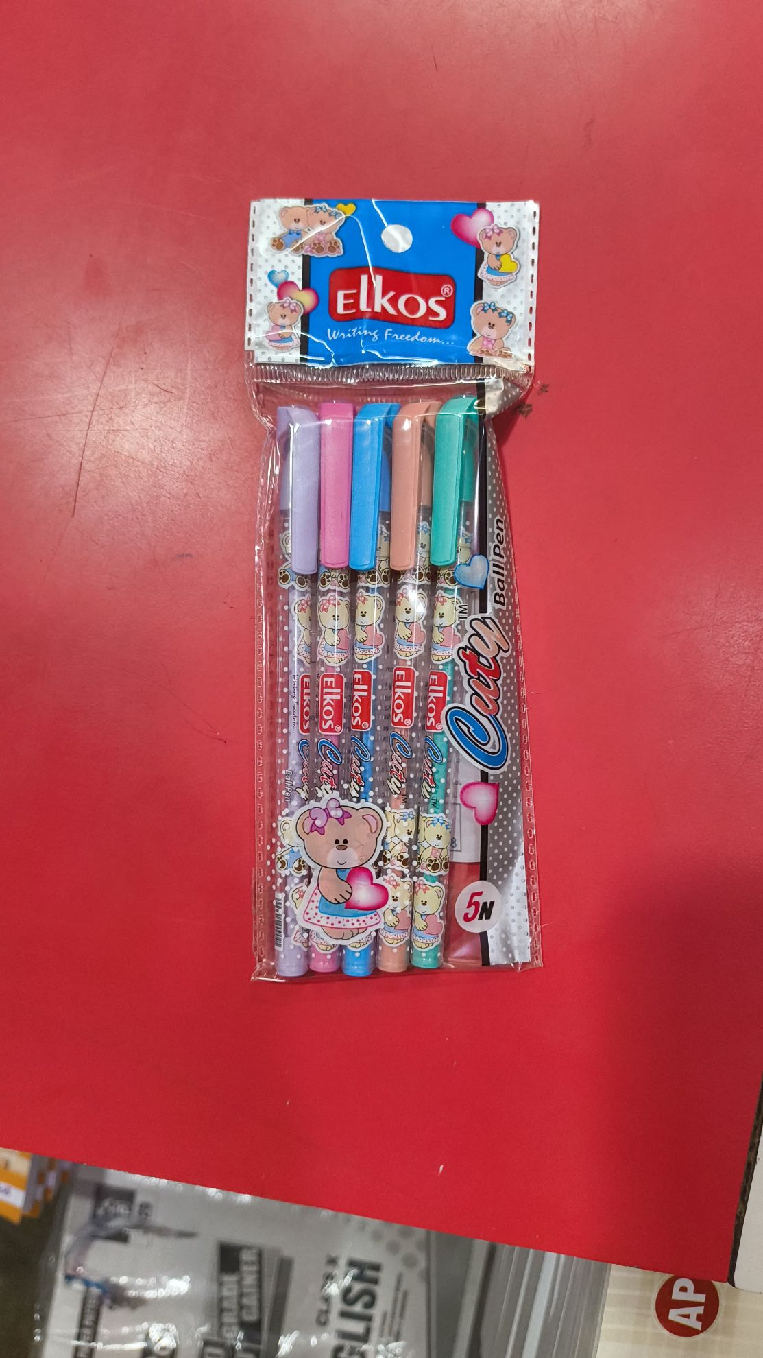 ఎల్కోస్ క్యూటీ బాల్ పెన్నుల ప్యాక్, ఇవి కాంపాక్ట్ మరియు అందమైన డిజైన్కు ప్రసిద్ధి చెందిన బాల్ పాయింట్ పెన్నులు, తరచుగా ప్యాకేజింగ్లో కనిపించే ఎలుగుబంటి వంటి కార్టూన్ పాత్రలను కలిగి ఉంటాయి. చిత్రాలు 5