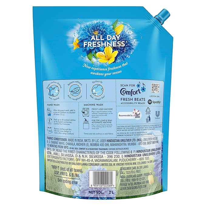 బ్రాండ్: కంఫర్ట్రూపం: ద్రవం (లిక్విడ్)నికర పరిమాణం: 2000 మిల్లీ లీటర్లుఅంశాల సంఖ్య: 1సుగంధం: ఫ్రెష్ (తాజా సువాసన)లాభాలు: వస్త్రాలకు మృదుత్వం ఇవ్వడంప్రత్యేకత: సుగంధ పర్ల్స్ తోవాల్యూమ్: 2000 మిల్లీ లీటర్లు (లీటర్లు అని చూపించబడినది పొరపాటు కావచ్చు)బరువు: 2000 గ్రాములుతయారీదారు:కంఫర్ట్, హెచ్యూఎల్సర్వే నెం: 907, కిల్వానీ రోడ్,అమ్లీ గ్రామం, గాంధీగ్రామ్ బస్ స్టాప్ సమీపంలో,సిల్వాస్సా - 396230,దాద్రా & నగర్ హవేలీ యుటి