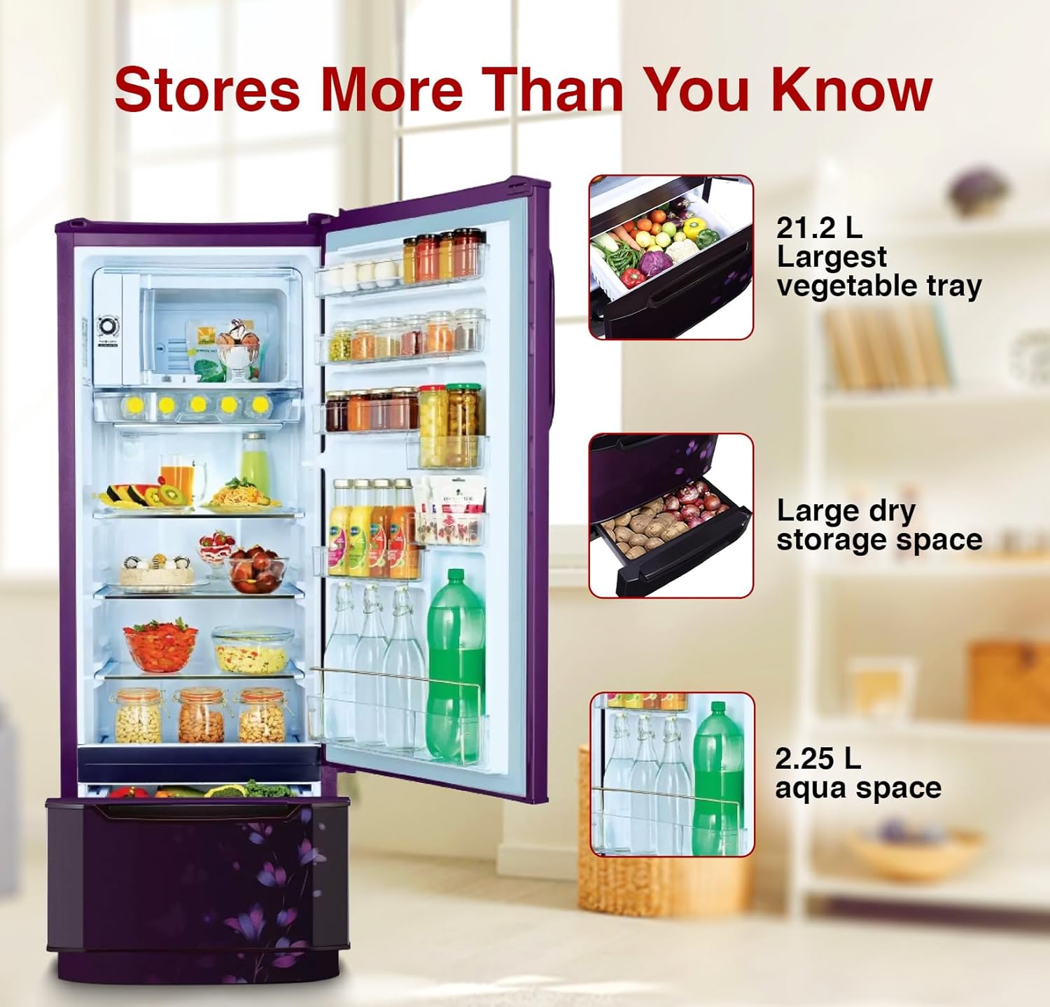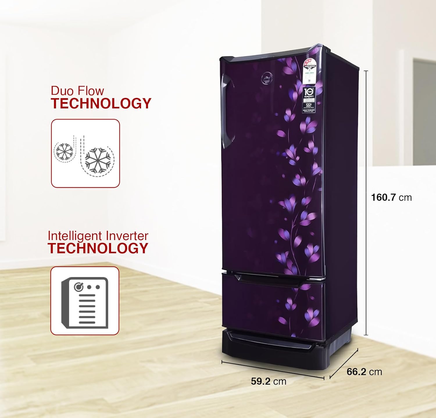 ఈ అంశం గురించిడైరెక్ట్ కూల్ రిఫ్రిజిరేటర్: ఆర్థికంగా మరియు స్టైలిష్గా ఉంటుందిసామర్థ్యం 237 L: 2 నుండి 3 మంది సభ్యులు ఉన్న కుటుంబాలకు అనుకూలం | ఫ్రీజర్ సామర్థ్యం: 22.2 L, తాజా ఆహార సామర్థ్యం: 214.8 Lశక్తి సామర్థ్యం: 3 నక్షత్రాలు: శక్తి సామర్థ్యం (మరిన్ని వివరాల కోసం దయచేసి ఉత్పత్తి పేజీలో లేదా కాంటాక్ట్ బ్రాండ్లోని శక్తి లేబుల్ను చూడండి), వార్షిక శక్తి వినియోగం సంవత్సరానికి 175 యూనిట్లుతయారీదారు వారంటీ: 10 సంవత్సరాల కంప్రెసర్ వారంటీ, 1 సంవత్సరం సమగ్ర వారంటీఇంటెలిజెంట్ ఇన్వర్టర్ టెక్నాలజీతో ఇన్వర్టర్ కంప్రెసర్: తెలివైన మరియు శక్తి సామర్థ్యం గల ఇన్వర్టర్ కంప్రెసర్, ఇది నిశ్శబ్దంగా ఉండటమే కాకుండా వేరియబుల్ స్పీడ్ కంప్రెసర్ కూడా, ఎందుకంటే ఇది రిఫ్రిజిరేటర్ ఆపరేషన్ ప్రకారం శీతలీకరణను సర్దుబాటు చేస్తుందినిల్వ లేదా అంతర్గత వివరణ: తాజా ఆహార సామర్థ్యం: 214.8 Ltr | ఫ్రీజర్ సామర్థ్యం: 22.2 Ltr | షెల్వ్లు: 2 | డ్రాయర్: 1 | షెల్ఫ్ రకం: టఫ్డ్ గ్లాస్ అల్మారాలు | రిఫ్రిజిరేటెడ్ కాని ఆహార పదార్థాల కోసం అదనపు స్థలం కోసం డ్రాయర్తో కూడిన బేస్ స్టాండ్ప్రత్యేక లక్షణాలు: ప్రత్యేక వెజ్జీ డ్రాయర్, డ్యూయో ఫ్లో టెక్నాలజీ, అతిపెద్ద ఫ్రీజర్, ఇంటెలిజెంట్ ఇన్వర్టర్ టెక్నాలజీ, 21.2 లీటర్ అతిపెద్ద వెజిటబుల్ ట్రే, టఫ్డ్ గ్లాస్ షెల్ఫ్లు, పెద్ద డ్రై స్టోరేజ్ స్పేస్, 2.25 లీటర్ ఆక్వా స్పేస్, తక్కువ స్టార్టింగ్ వోల్టేజ్ (140V)