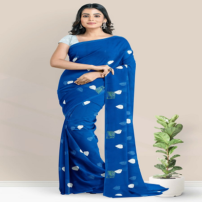 జార్జెట్ ఫ్యాన్సీ చీర అనేది మృదువైన జార్జెట్ ఫాబ్రిక్ నుండి తయారు చేయబడిన తేలికైన, షీర్ మరియు ఫ్లోవీ డ్రేప్, ఇది దాని అందమైన ఫాల్ మరియు సులభమైన డ్రేపింగ్కు ప్రసిద్ధి చెందింది. ఈ చీరలు తరచుగా క్లిష్టమైన ప్రింట్లు, సున్నితమైన ఎంబ్రాయిడరీ, సీక్విన్స్ లేదా రాతి అలంకరణలను కలిగి ఉంటాయి, ఇవి మెరుపు మరియు అధునాతనతను జోడిస్తాయి. జార్జెట్ యొక్క గాలితో కూడిన ఆకృతి సొగసైన సిల్హౌట్ను కొనసాగిస్తూ ఎక్కువ గంటలు ధరించడానికి సౌకర్యంగా ఉంటుంది. పండుగ వేడుకలు, వివాహాలు, పార్టీలు లేదా అధికారిక సమావేశాలకు సరైనది, జార్జెట్ ఫ్యాన్సీ చీరలు ఆధునిక శైలితో సాంప్రదాయ ఆకర్షణను మిళితం చేస్తాయి. వాటి బహుముఖ ప్రజ్ఞ సృజనాత్మక డ్రేపింగ్ శైలులను అనుమతిస్తుంది, చీర యొక్క గొప్ప రంగులు, నమూనాలు మరియు అలంకార సరిహద్దులను హైలైట్ చేస్తుంది, అద్భుతమైన, ప్రత్యేకమైన రూపాన్ని ఇస్తుంది.