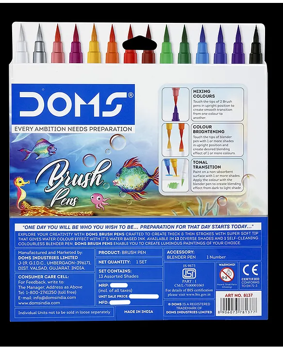 12 అద్భుతమైన రంగులతో పాటు మెటాలిక్ సిల్వర్ బ్రష్ పెన్ మరియు బ్లెండర్ బ్రష్ పెన్ను కలిగి ఉన్న శక్తివంతమైన DOMS బ్రష్ పెన్నుల సెట్. ఈ పెన్నులు సున్నితమైన అప్లికేషన్ కోసం సూపర్ సాఫ్ట్ టిప్ను కలిగి ఉంటాయి, ఇవి రంగులు వేయడం, అక్షరాలను రాయడం మరియు స్కెచింగ్కు అనువైనవిగా చేస్తాయి. ప్యాకేజింగ్ ఆకర్షణీయమైన నీటి అడుగున థీమ్ను చూపిస్తుంది, ఇవి యువ కళాకారులు మరియు అభిరుచి గలవారికి సరైనవని సూచిస్తున్నాయి.