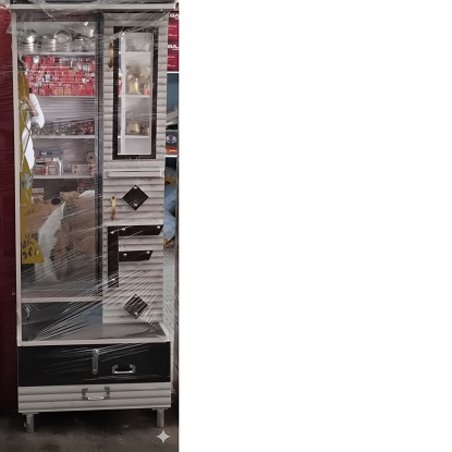 ఎడమ వైపు (షోకేస్/డిస్ప్లే): లోపల బహుళ అల్మారాలను చూపించే గాజు తలుపులు (లేదా స్పష్టమైన ప్లాస్టిక్/యాక్రిలిక్ కవరింగ్) ఉన్నాయి. అల్మారాలు ప్రస్తుతం వస్తువులతో నిల్వ చేయబడ్డాయి (సామానులు, బహుశా కొన్ని ప్యాక్ చేయబడిన వస్తువులు లేదా పెట్టెలు లాగా కనిపిస్తాయి). కంటెంట్ ప్రకారం ఇది వంటగది నిల్వ యూనిట్ లేదా సాధారణ యుటిలిటీ/డిస్ప్లే క్యాబినెట్ కావచ్చు.