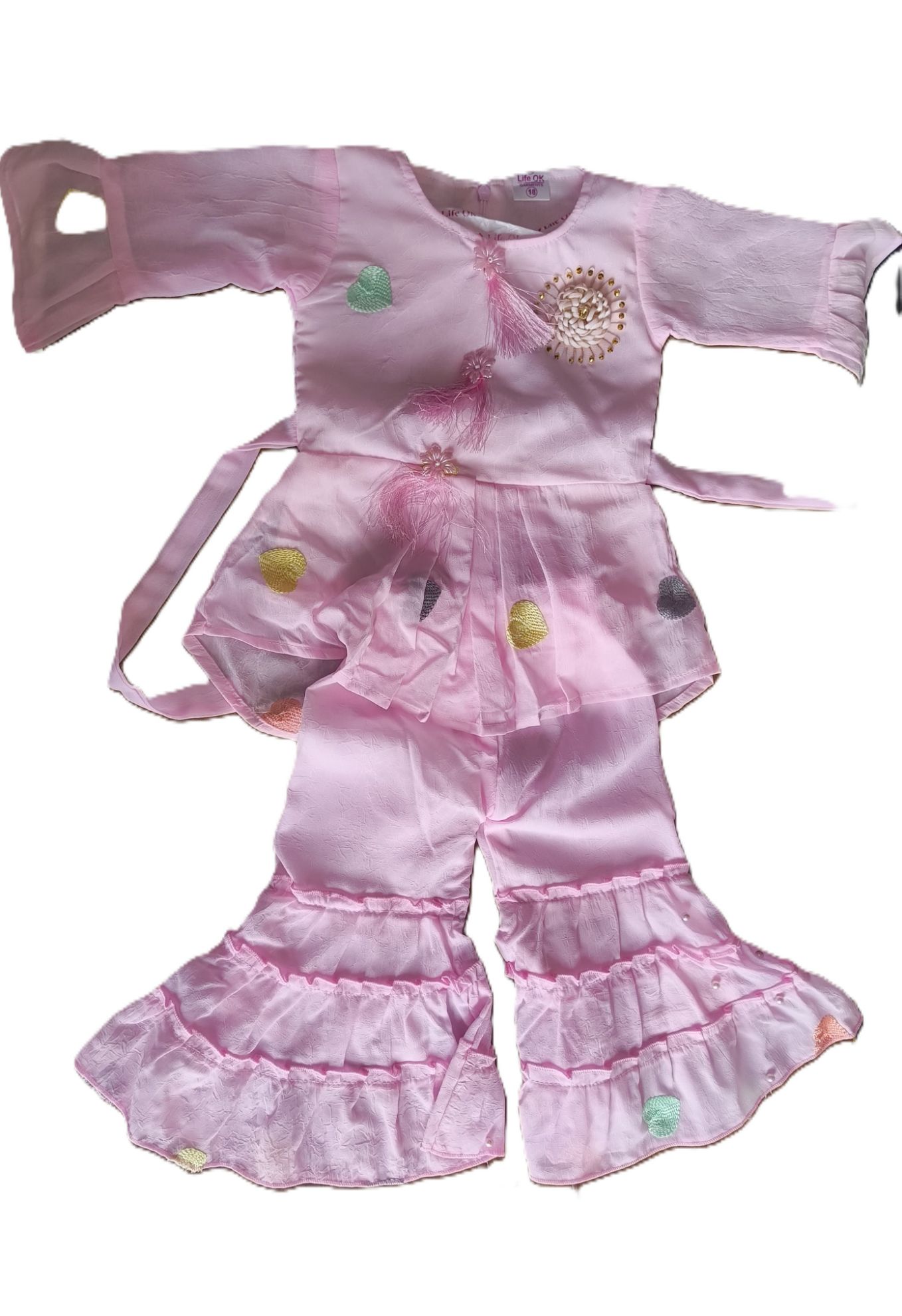 ఈ సెట్ (టాప్ మరియు బాటమ్) మీద అల్లిక (ఎంబ్రాయిడరీ), బీడ్స్, లేదా ఇతర అలంకారిక శోభను ఇచ్చే వస్తువులు ఉంటాయి. ఇవి చీరా లాగా మెరిసే మరియు సంప్రదాయ శోభ కలిగించే విధంగా ఉంటాయి.