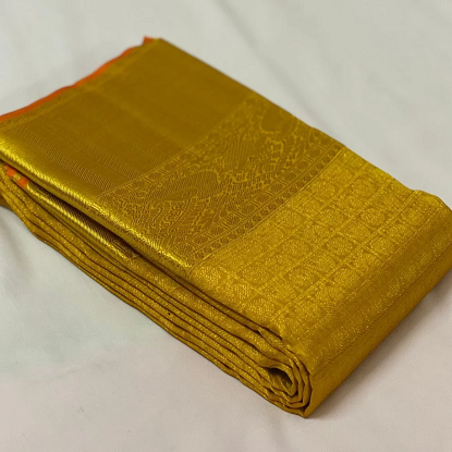 బంగారు జరీ దారంతో తయారు చేసిన కాంచీపురం పట్టు చీర దక్షిణ భారత సంప్రదాయ వైభవాన్ని ప్రతిబింబించే ఒక అపురూప కళాఖండం. స్వచ్ఛమైన మల్బరీ పట్టుతో చేతితో నేయబడిన ఈ చీరలో క్లిష్టమైన నమూనాలు మరియు సొగసు మరియు విలాసాన్ని ప్రసరింపజేసే గొప్ప బంగారు జరీ ఉన్నాయి. దాని మన్నిక మరియు మెరిసే ముగింపుకు ప్రసిద్ధి చెందిన ఈ చీర అందంగా అలంకరించబడి, వివాహాలు, పండుగ వేడుకలు మరియు ప్రత్యేక సందర్భాలలో విలువైన ఎంపికగా మారుతుంది. చక్కటి జరీ నేతతో పట్టు షీన్ యొక్క అద్భుతమైన పరస్పర చర్య దాని దృశ్య ఆకర్షణను పెంచడమే కాకుండా దాని సాంస్కృతిక మరియు వారసత్వ విలువను కూడా పెంచుతుంది. సంప్రదాయం, చేతిపనులు మరియు శైలి యొక్క పరిపూర్ణ సమ్మేళనం, ఈ చీర ప్రతి మహిళ వార్డ్రోబ్కు విలువైన అదనంగా ఉంటుంది.