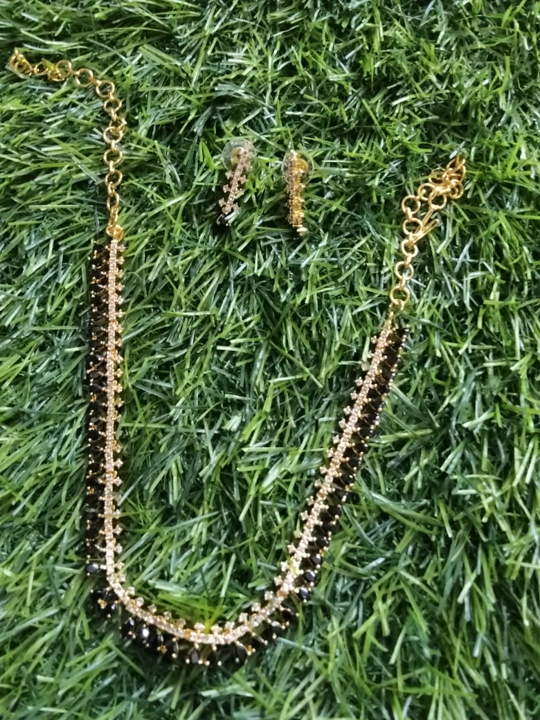 సాంప్రదాయ నల్ల పూసల నెక్లెస్ సెట్, మంగళసూత్ర-శైలి నెక్లెస్తో పాటు సరిపోయే చెవిపోగులు.