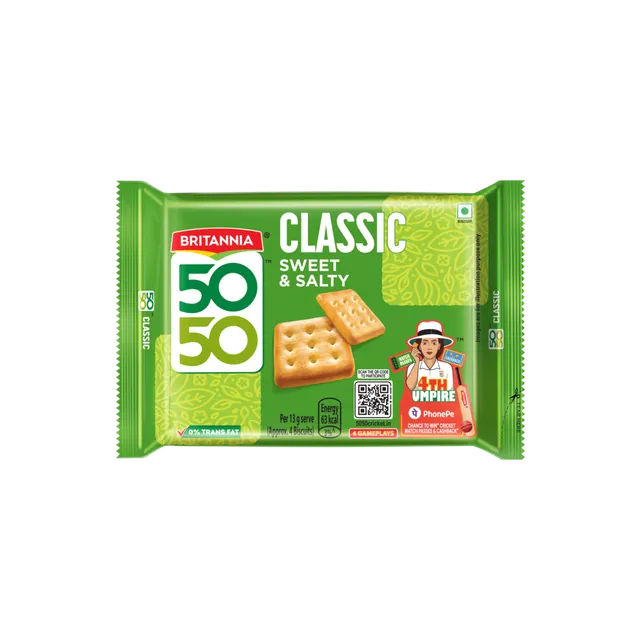 బ్రిటానియా 50-50 బిస్కెట్లు తీపి మరియు ఉప్పుగా ఉండే రుచితో ఉంటాయి, వాటిని అసాధారణంగా రుచికరమైనవి మరియు సరదాగా తినదగ్గవిగా మారుస్తుంది. ఈ బిస్కెట్లకు నోరూరించే రుచి ఉంది మరియు అవి టీ లేదా మిల్క్ కాఫీతో అద్భుతంగా సరిపోతాయి. ఆకలేస్తే, వెంటనే ఒక ప్యాక్ బ్రిటానియా 50-50 స్వీట్ అండ్ సాల్టీ బిస్కెట్లు తీసుకోండి!