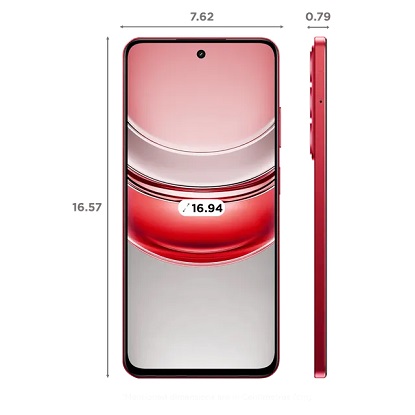 ఫీచర్ వివరాలుప్రాసెసర్ / చిప్సెట్మీడియాటెక్ డైమెన్సిటీ 6300 5G (6 nm ప్రాసెస్)RAM & స్టోరేజ్6 GB లేదా 8 GB RAM; 128 GB ఇంటర్నల్ స్టోరేజ్. డైనమిక్ RAM విస్తరణ (వర్చువల్ RAM) కు కూడా మద్దతు ఇస్తుంది. డిస్ప్లే6.67-అంగుళాల IPS LCD (HD+ రిజల్యూషన్ — 720 × 1604), 120Hz వరకు రిఫ్రెష్ రేట్, 180Hz టచ్ శాంప్లింగ్ రేట్, పీక్ బ్రైట్నెస్ ~625 nits.బ్యాటరీ6,000 mAh బ్యాటరీ, 45W ఫాస్ట్ ఛార్జింగ్తో కెమెరా వెనుక: 50 MP ప్రధాన కెమెరా (OV50D), + సెకండరీ లెన్స్; ముందు: 8 MP. మన్నిక / బిల్డ్IP69 (దుమ్ము & నీటి నిరోధకత). "రెయిన్వాటర్ స్మార్ట్ టచ్", మిలిటరీ-గ్రేడ్ షాక్ రెసిస్టెన్స్ మరియు డ్రాప్స్ కోసం "ఆర్మర్షెల్" రక్షణ కూడా ఉన్నాయి. ఇతర ఫీచర్లుసైడ్-మౌంటెడ్ ఫింగర్ ప్రింట్ సెన్సార్; డ్యూయల్ సిమ్; డ్యూయల్ 5G; హై-రెస్ ఆడియో సపోర్ట్; రియల్మీ UI 5.0తో ఆండ్రాయిడ్ 14.