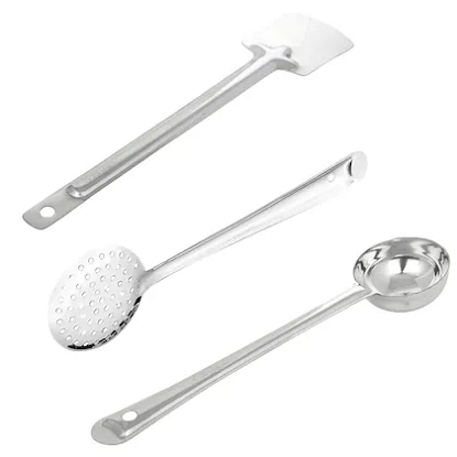 ఉత్పత్తి ప్రయోజనాలు 3-ఇన్-1 కాంబో - సర్వింగ్ కోసం లాడిల్ (కరచ్చి), వేయించడానికి స్కిమ్మర్ (जारा) మరియు తిప్పడానికి టర్నర్/స్పాటులా (పాల్టా) ఉన్నాయి. స్టెయిన్లెస్ స్టీల్ బిల్డ్ - బలమైన, మన్నికైన, తుప్పు-నిరోధకత మరియు దీర్ఘకాలం ఉంటుంది. బహుళార్ధసాధక ఉపయోగం - ఆహారాన్ని వండడానికి, వేయించడానికి, వడ్డించడానికి మరియు తిప్పడానికి అనుకూలం. ఎర్గోనామిక్ హ్యాండిల్స్ - వంట సమయంలో సౌకర్యవంతమైన పట్టు మరియు సురక్షితమైన నిర్వహణ. వేడి నిరోధకత - నష్టం లేకుండా అధిక ఉష్ణోగ్రతలను తట్టుకోగలదు. శుభ్రం చేయడం సులభం - మృదువైన స్టెయిన్లెస్ స్టీల్ ఉపరితలం త్వరగా కడగడానికి అనుమతిస్తుంది. పరిశుభ్రత & సురక్షితం - ఆహార-సురక్షిత పదార్థం, పదార్థాలతో స్పందించదు.