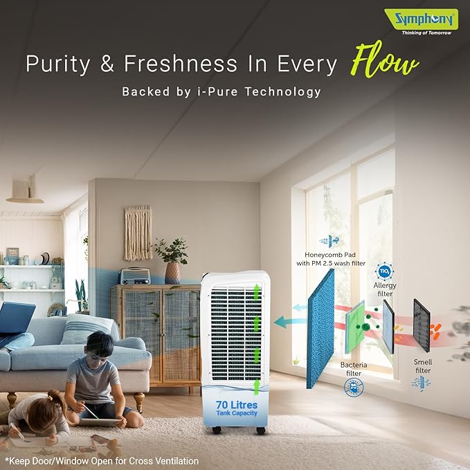 సింఫనీ విండ్బ్లాస్ట్ 70 XL డెసర్ట్ ఎయిర్ కూలర్ ఫర్ హోమ్ ఫర్ పవర్ ఫుల్ ఫ్యాన్, హనీకోంబ్ ప్యాడ్లు, ఐ-ప్యూర్ టెక్నాలజీ మరియు తక్కువ పవర్ వినియోగం (70L, వైట్) పాత ధర: ₹15,999.00