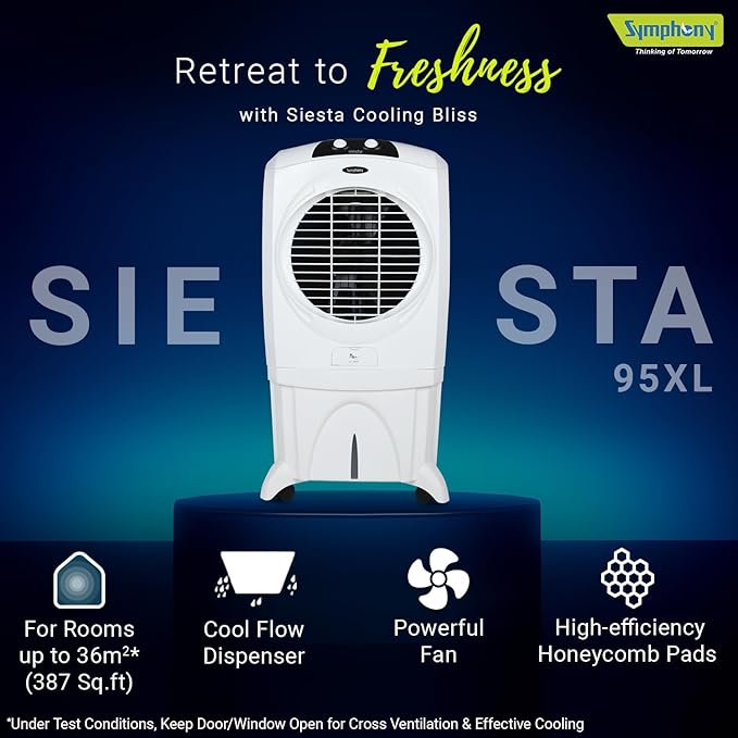 వివరణతీవ్రమైన వాతావరణ పరిస్థితుల్లో మీరు సౌకర్యవంతంగా ఉండేందుకు సింఫనీ ఎయిర్ కూలర్ అనేక ఫీచర్లను కలిగి ఉంది. ఇది ప్రభావవంతమైన శీతలీకరణను ఏకరీతిగా అందించడానికి కూల్ ఫ్లో డిస్పెన్సర్తో పాటు శక్తివంతమైన బ్లోవర్ను కలిగి ఉంటుంది. ఈ ఇన్వర్టర్-అనుకూల కూలర్ ఇన్వర్టర్లతో బాగా పనిచేస్తుంది కాబట్టి మీరు కరెంటు ఆగిపోయినప్పుడు కూడా అంతరాయం లేని శీతలీకరణను ఆస్వాదించవచ్చు. దాని ఆటో-లౌవ్రే కదలిక ఫీచర్ మీ గదిలోని ప్రతి మూలకు చల్లని గాలిని అందిస్తుంది. ఇది డ్రెయిన్ ప్లగ్, వాటర్ ఓవర్ఫ్లో అవుట్లెట్, వాటర్ లెవెల్ ఇండికేటర్ మరియు మెరుగైన సౌకర్యాన్ని అందించడానికి మరిన్నింటిని కూడా కలిగి ఉంది.