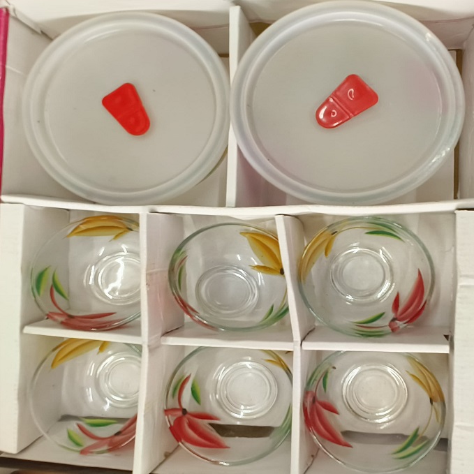 4 మినీ గ్లాస్ బౌల్స్, 2 ప్లాస్టిక్ బాక్సులు