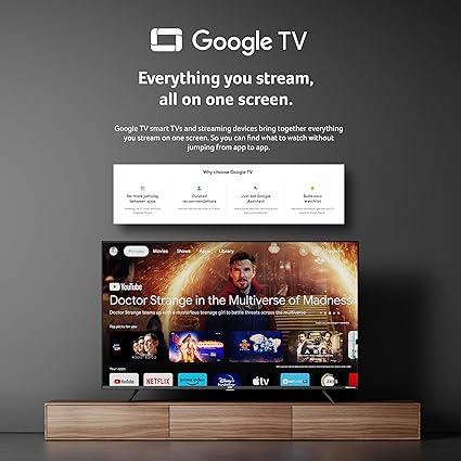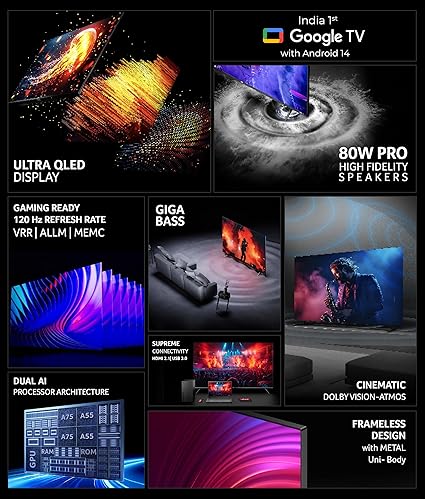 రిజల్యూషన్: అల్ట్రా QLED | 4K అల్ట్రా HD (3840 x 2160) | రిఫ్రెష్ రేట్: 60 హెర్ట్జ్ | 178 డిగ్రీ వైడ్ వ్యూయింగ్ యాంగిల్కనెక్టివిటీ: డ్యూయల్-బ్యాండ్ వైఫై | బ్లూటూత్ 5.2 | AV, RF, ఈథర్నెట్, హెడ్ఫోన్×1 | 120Hz VRR | ALLM | పర్సనల్ కంప్యూటర్, ల్యాప్టాప్, సెట్-టాప్ బాక్స్, గేమింగ్ కన్సోల్ను కనెక్ట్ చేయడానికి HDMI పోర్ట్లు 2.1 x 3 | హార్డ్ డ్రైవ్లు లేదా ఇతర USB పరికరాన్ని కనెక్ట్ చేయడానికి USB 2.0x1, 3.0x1సౌండ్: 80 వాట్స్ అవుట్పుట్ | GIGA BASSతో హై ఫిడిలిటీ స్పీకర్లు | డాల్బీ అట్మాస్ + డాల్బీ MS12_Z | డ్యూయల్ యాంప్లిఫైయర్ - వూఫర్ - ట్వీటర్ | eARC | 5 సౌండ్ మోడ్లు - స్టాండర్డ్, స్పీచ్, మ్యూజిక్, స్టేడియం, యూజర్స్మార్ట్ టీవీ ఫీచర్లు: ఆండ్రాయిడ్ 14తో గూగుల్ టీవీ | కంటెంట్ సిఫార్సులు | డ్యూయల్ బ్యాండ్ వైఫై | బ్లూటూత్ 5.2 | కాస్టింగ్ ఆప్షన్- గూగుల్కాస్ట్, ఫాస్ట్కాస్ట్, మీటింగ్ మోడ్ | 2.0GB RAM | 16GB నిల్వ | వాచ్లిస్ట్ | వ్యక్తిగత ప్రొఫైల్ | పిల్లల ప్రొఫైల్ | Google అసిస్టెంట్ | వాయిస్ ఎనేబుల్డ్ స్మార్ట్ రిమోట్ | త్వరిత యాక్సెస్ కోసం హాట్కీలు - Netflix, Prime Video, YouTube, Disney+Hotstar | క్వాడ్ కోర్ ప్రాసెసర్ | స్క్రీన్ సేవర్ |ECO మోడ్ | వీడియో కాలింగ్- Google మీటింగ్ మరియు ట్రూకాన్ఫరెన్స్ | గేమ్ప్యాడ్ ఫాస్ట్కాస్ట్, మీటింగ్ మోడ్ | 2GB RAM | 16GB నిల్వ | వాచ్లిస్ట్ | వ్యక్తిగత ప్రొఫైల్ | పిల్లల ప్రొఫైల్ | Google అసిస్టెంట్ | అంతర్నిర్మిత Chromecast | వాయిస్ ఎనేబుల్డ్ స్మార్ట్ రిమోట్ | త్వరిత యాక్సెస్ కోసం హాట్కీలు - Netflix, Prime Video, YouTube, Disney+Hotstar | DUAL AI- CORE ప్రాసెసర్ | స్క్రీన్ సేవర్ | ECO మోడ్ | వీడియో కాలింగ్- Google మీటింగ్ మరియు ట్రూకాన్ఫరెన్స్ | గేమ్ప్యాడ్డిస్ప్లే: అల్ట్రా QLED | Ai పిక్చర్ ఆప్టిమైజేషన్ | 4K HDR | 120Hz VRR | HDR10- HLG | MEMC | డాల్బీ విజన్ | ALLMవారంటీ సమాచారం: కొనుగోలు తేదీ నుండి ఉత్పత్తిపై 1 సంవత్సరం సమగ్ర వారంటీ