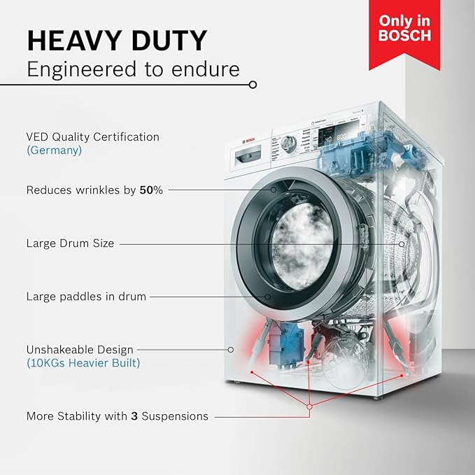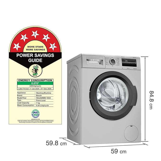 పూర్తిగా ఆటోమేటిక్ ఫ్రంట్ లోడ్ వాషింగ్ మెషిన్: గొప్ప వాష్ నాణ్యతతో సరసమైనది, ఉపయోగించడానికి సులభం కెపాసిటీ 7 కిలోలు: 3 – 4 మంది సభ్యులకు అనుకూలం శక్తి రేటింగ్: 5 స్టార్ - తరగతి సామర్థ్యంలో ఉత్తమమైనది, తగ్గిన విద్యుత్ వినియోగాన్ని నిర్ధారిస్తుంది వారంటీ: ఉత్పత్తిపై 2 సంవత్సరాల వారంటీ, మోటారుపై 12 సంవత్సరాల వారంటీ 1200 RPM : అధిక స్పిన్ వేగం స్పిన్ సైకిల్ సమయంలో బట్టల నుండి నీటిని బాగా తీయడానికి సహాయపడుతుంది, ఫలితంగా వేగంగా ఆరిపోతుంది.