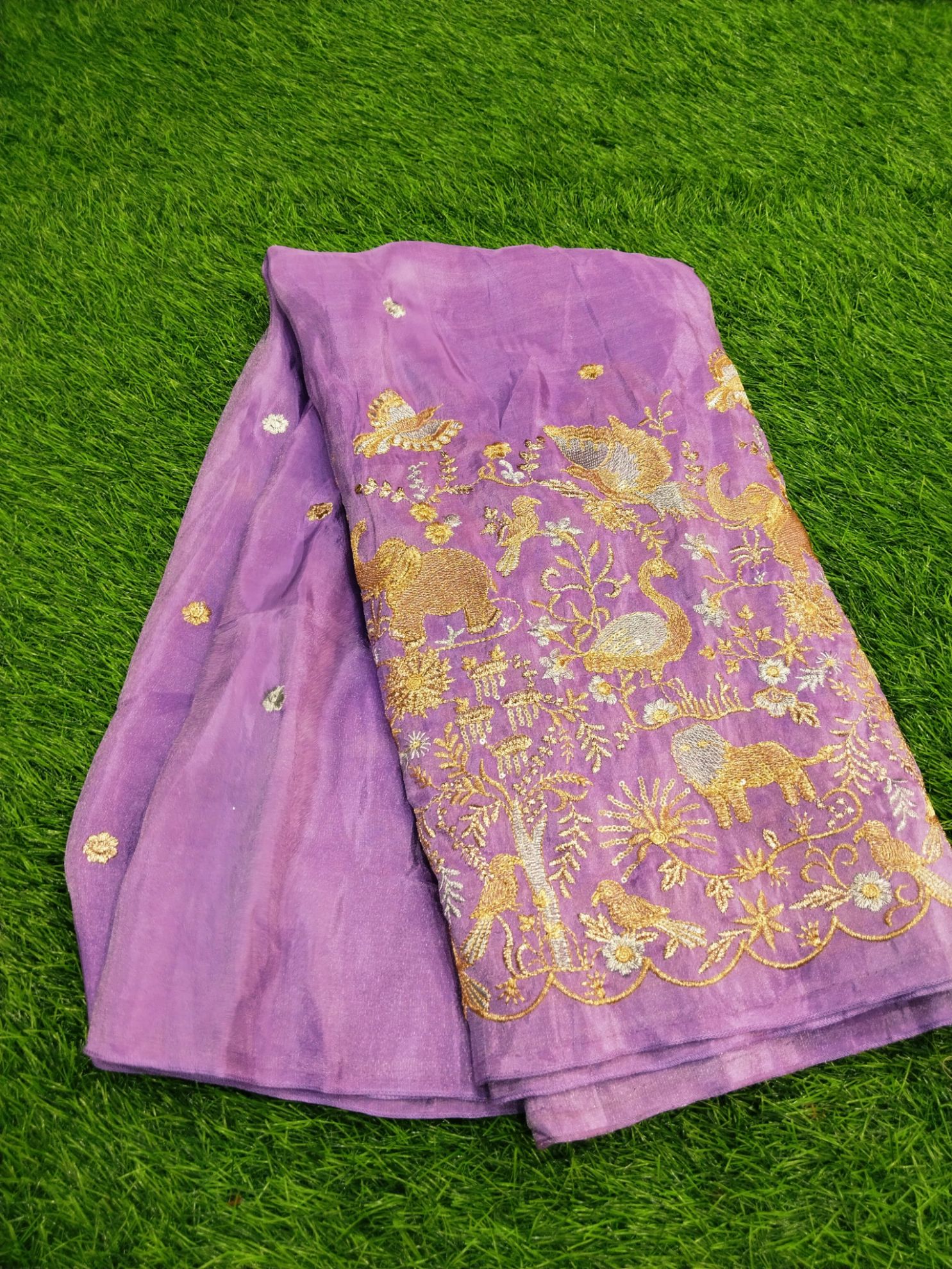 Golden and silver zari embroidery with motifs of animals (elephant, lion, bird, etc.)