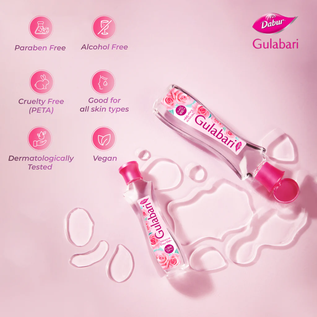 Discover the daily skincare savior you've been searching for with Dabur Gulabari Rose Water. Infused with the essence of pure roses, this gentle yet powerful formula offers a multitude of benefits for your skin. Acting as a non-alcoholic toner, it cleanses, tones, and moisturizes, leaving your skin radiant, acne-free, and youthful. Say goodbye to impurities as it purifies, removes makeup, and dirt, while protecting against bacterial infections. With its pH-balancing properties, it restores harmony to your skin, offering a calming effect on acne. Experience the rejuvenating power of rose water, unlocking naturally glowing and radiant skin with each use. Make Dabur Gulabari Rose Water an essential part of your skincare routine and embrace the beauty of rose-infused skincare.