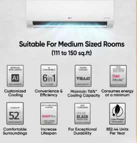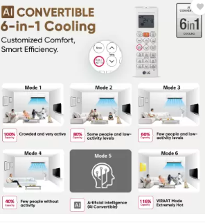 LG 2025 మోడ్ AI కన్వర్టిబుల్ 6-ఇన్-1 1.5 టన్ 3 స్టార్ స్ప్లిట్ AI డ్యూయల్ ఇన్వర్టర్ విత్ ఫాస్టర్ కూలింగ్ అండ్ ఎనర్జీ సేవింగ్, VIRAAT మోడ్ అండ్ డైట్ మోడ్ ప్లస్ AC - వైట్ (US-Q18JNXE, కాపర్ కండెన్సర్) ఈ LG AI-కన్వర్టిబుల్ 6-ఇన్-1 ACలో డ్యూయల్ ఇన్వర్టర్ కంప్రెసర్ అమర్చబడి ఉంటుంది, ఇది సరైన శీతలీకరణ పనితీరును అందిస్తుంది. దీని ఎనర్జీ-సేవింగ్ మోడ్ గది ఉష్ణోగ్రత స్థాయిలను నిర్వహించడానికి కంప్రెసర్ వేగాన్ని స్థిరంగా మారుస్తుంది, గరిష్ట సౌకర్యాన్ని అందిస్తుంది. అదనంగా, ఈ AC హై-స్పీడ్ కూలింగ్ రేజెస్, AI డ్యూయల్ ఇన్వర్టర్, VIRAAT మోడ్, గోల్డ్ ఫిన్+, ఓషన్ బ్లాక్ ప్రొటెక్షన్ మరియు ADC సెన్సార్తో వస్తుంది. ఇది హై-గ్రూవ్డ్ కాపర్ పైపులు, స్టెబిలైజర్-ఫ్రీ ఫంక్షన్లు, తక్కువ గ్యాస్ డిటెక్షన్, డైట్ మోడ్+, మ్యూట్ ఫంక్షన్, యాంటీ-వైరస్ ప్రొటెక్షన్, 4-వే స్వింగ్, 50 అడుగుల ఎయిర్ఫ్లో, స్మార్ట్ డయాగ్నసిస్, HD ఫిల్టర్, మాన్సూన్ కంఫర్ట్ మోడ్, ఆటో క్లీన్ ఫీచర్ మరియు R32 రిఫ్రిజెరాంట్ వంటి ఇతర బహుముఖ సౌకర్యాలను కూడా కలిగి ఉంటుంది.