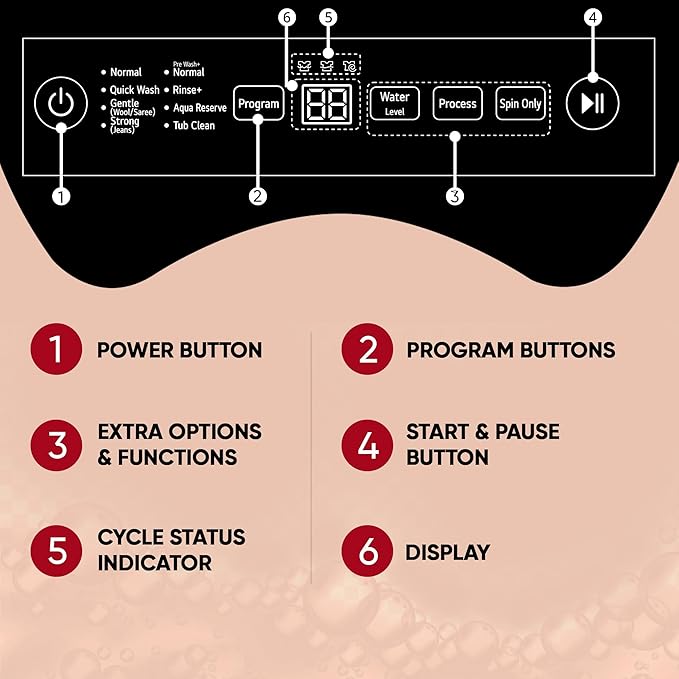 LED డిస్ప్లే: ప్రస్తుత సెట్టింగ్స్, మిగిలిన సమయం, ఎర్రర్ మెసేజ్లు, డిలే స్టార్ట్ తదితర వివరాలు చూపుతుంది
