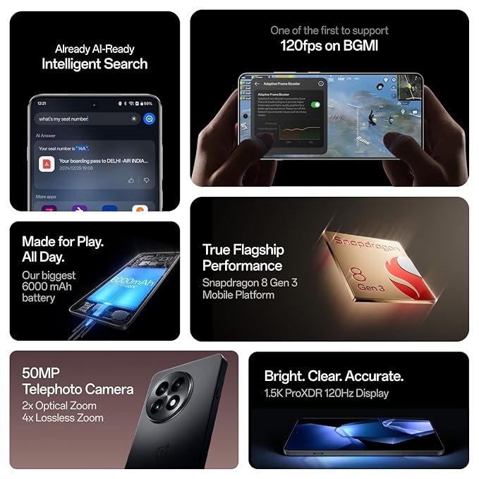 Snapdragon 8 Gen 3 చిప్సెట్తో వస్తుంది. ఇది OnePlus 12R కంటే 98% వేగవంతమైన AI మరియు 30% వేగవంతమైన CPU పనితీరును అందిస్తుంది. గేమింగ్ కోసం పవర్ వాడకాన్ని తగ్గిస్తూ వేడి తగ్గిస్తుంది.