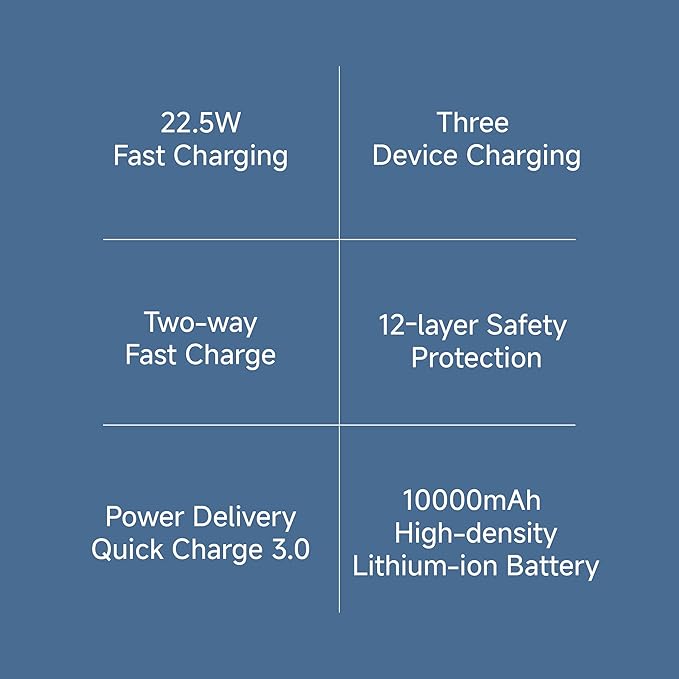 ఈ 10000mAh పవర్ బ్యాంక్ సహాయంతో మీరు ఎక్కడున్నా మీ డివైస్లను వేగంగా ఛార్జ్ చేసుకోవచ్చు. ఇది 22.5W ఫాస్ట్ ఛార్జింగ్ సామర్థ్యాన్ని కలిగి ఉండి, పవర్ డెలివరీ (PD) మరియు **క్విక్ చార్జ్ 3.0 (QC 3.0)**కు మద్దతు ఇస్తుంది. మొబైళ్లతో పాటు, టాబ్లెట్లు, ఇయర్బడ్స్, స్మార్ట్వాచెస్, ఎయిర్పాడ్స్, సెక్యూరిటీ కెమెరాలు మొదలైన డివైస్లను వేగంగా ఛార్జ్ చేయవచ్చు.